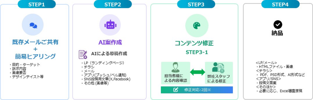 既存メールの共有と簡単なヒアリングで、簡単にAIがたたき台を作成し、その後、1~2回の修正依頼を経て、完全版を納品します。