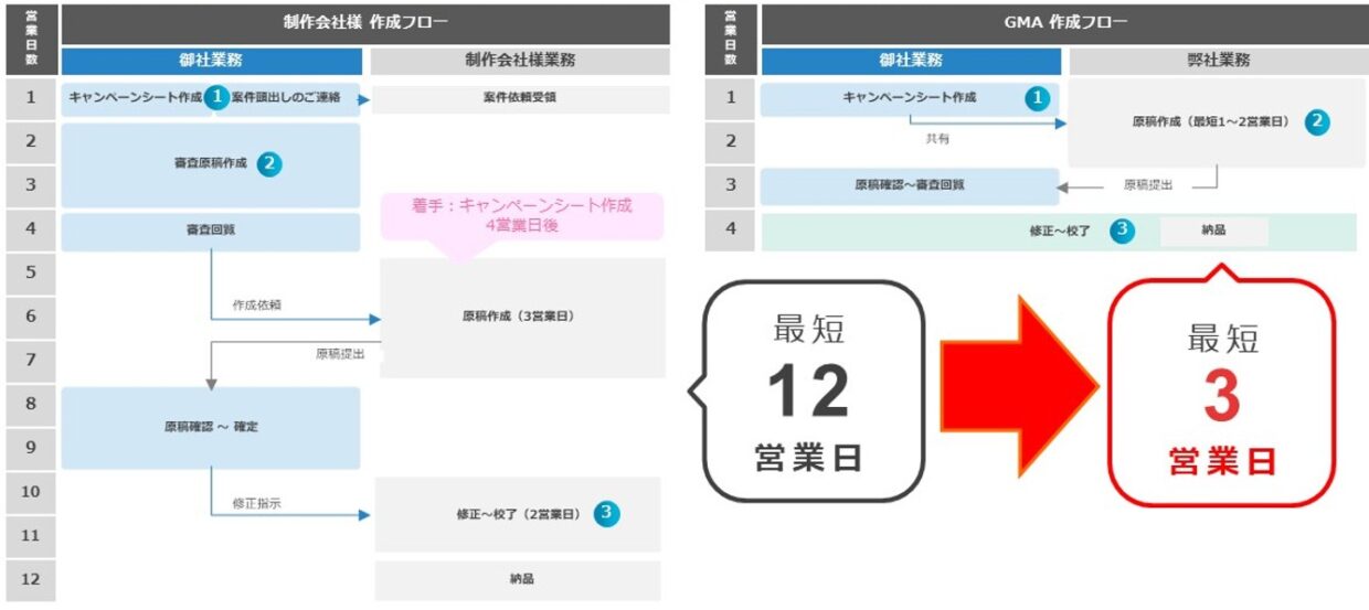 従来、メールやランディングページ(以下、LP)、チラシなどのデザイン作成作業は、担当者が要件を整理して、制作会社に依頼し、1週間以上の時間を経て、依頼元に戻り、修正作業を何度も交わす流れでした。